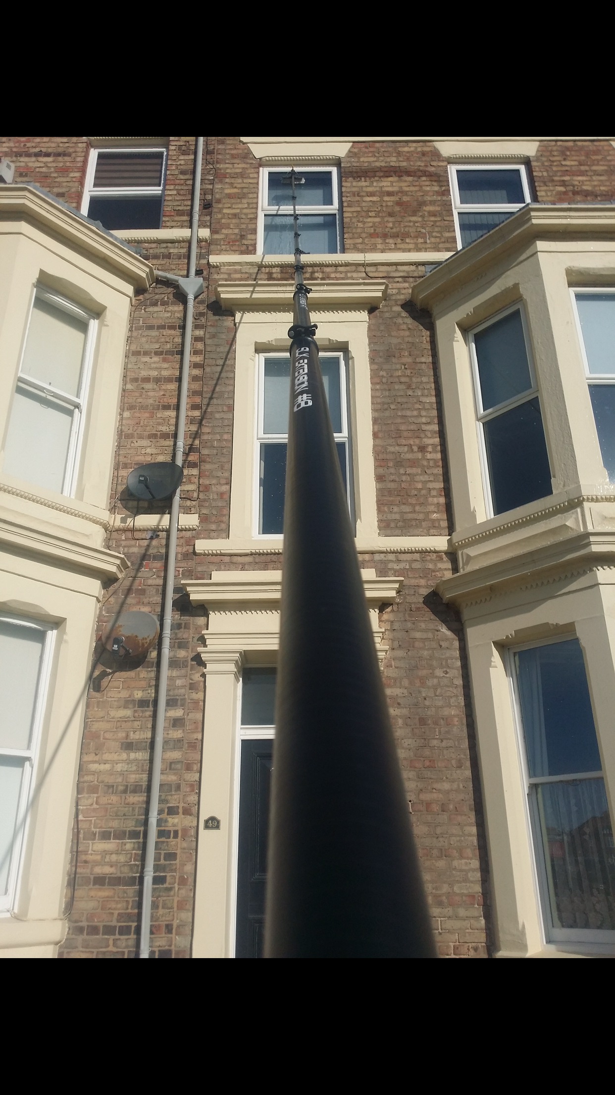 Pure water is brilliant at cleaning windows, it works along with a waterfed pole with soft-filament brushes to agitate the dirt and a pump to get the water out of our water tank in our van and up the pole to deliver a constant stream of pure water which washes away all the suspended dirt to leave clean frames and a streak free shine on the glass.